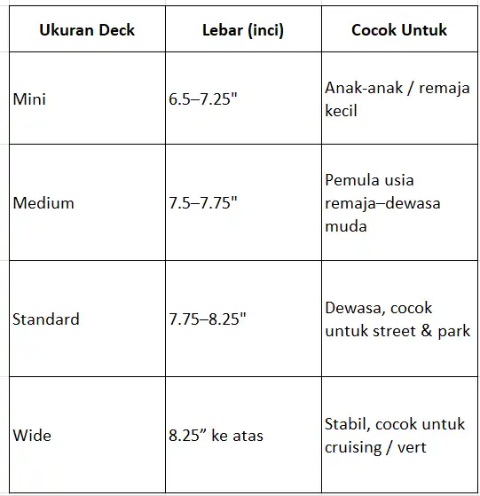 Bagian papan (deck) adalah inti dari skateboard. Ukurannya menentukan kenyamanan dan stabilitas saat digunakan.